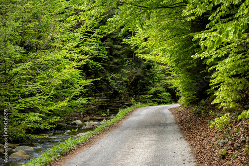 © Joanna Posiak, Obraz premium Road through spring forest with beautiful sunlight