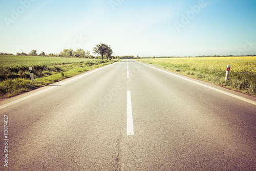 Naklejka premium Road through the beautiful yellow field countryside landscape