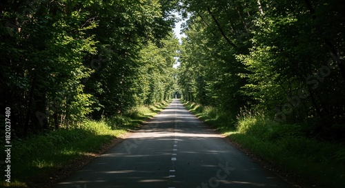 Fototapeta premium Road Through the Verdant Canopy: A picturesque road stretches into the distance, framed by a vibrant archway of lush green trees, creating a captivating scene of natural beauty and tranquility.