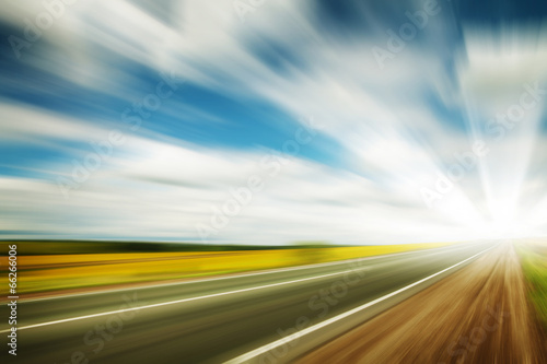 © evgeeenius, Naklejka premium Road through the yellow sunflower field