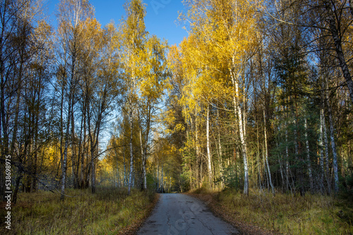 © Sergei, Obraz premium Road through yellow trees. Bright sunny day in the autumn forest.