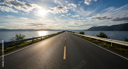 Fototapeta premium Road to adventure: a picturesque highway by the water's edge, under a bright,...