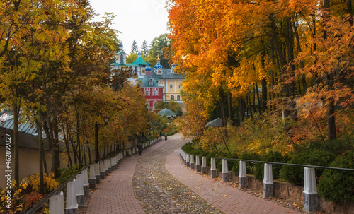 © Lana Kray, Naklejka premium road to beautiful churches in the Dormition Pskovo Pechersky Monastery in the city of Pechery, Pskov Region, Russia during the golden autumn