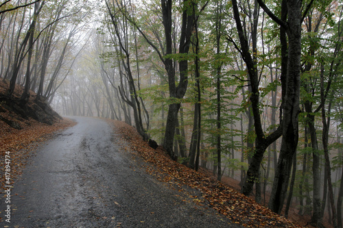 © yanakoroleva27, Fototapeta premium Road to fog in autumn forest