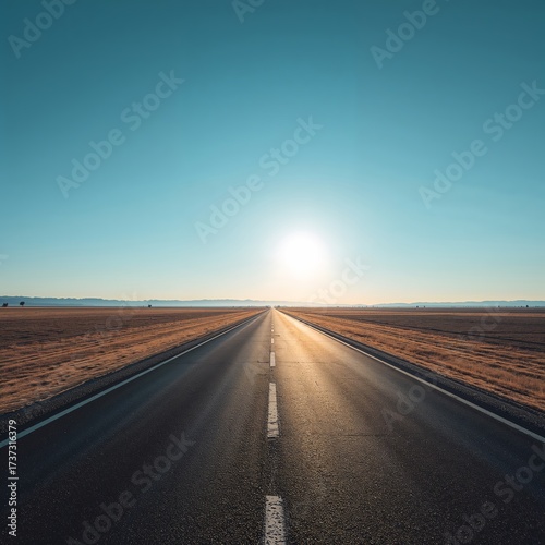 Naklejka premium Road to Horizon: An endless road stretches towards the horizon, framed by fields under a vast blue sky, inviting exploration and adventure.