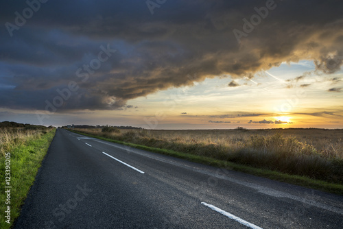 © stevie_uk, Naklejka premium Road to Kennack with stormy looking sunset, Lizard peninsula, Cornwall, UK