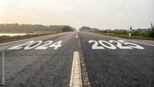 Fototapeta premium Road to 2025: New Year, New Journey - Asphalt road, years 2024 and 2025 painted, sunrise, journey, future. Represents progress, time, new beginnings and planning.