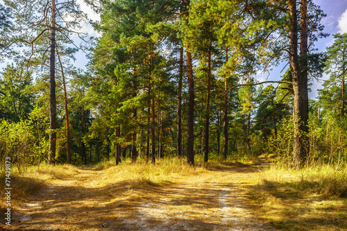 © Dmytro Holbai, Obraz premium Road to pine forest in the autumn sunny day