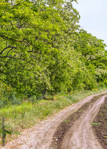 Fototapeta premium Road to the field along the flowering acacias