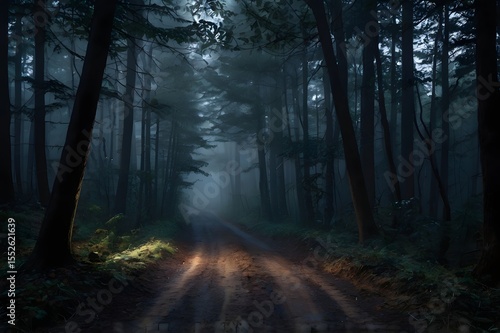 Obraz premium Road to the light in dark mysterious forest with fog.