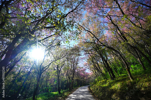 Naklejka premium Road to the peak of the mountain that full of big tree and pink flower...