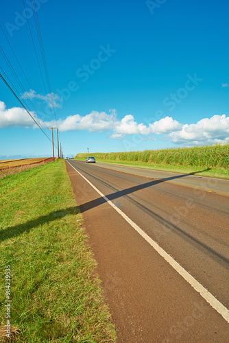 Fototapeta premium Road, travel and car for drive in nature, route and weekend trip to...