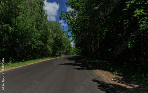 Fototapeta premium Road view on a summer day. Highways and roadside, white road line markings.