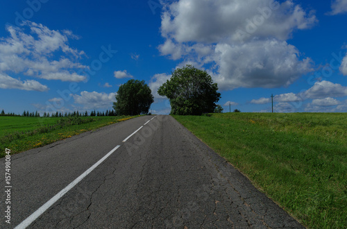 © Kozlik_mozlik, Fototapeta premium Road view on a summer day. Highways, roadside and white road line markings.