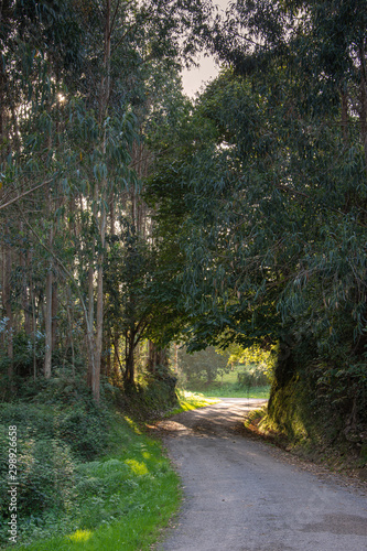 © Arantxa Forcada, Fototapeta premium Road view with trees, eucalyptus and chestnut trees at sunset in vertical