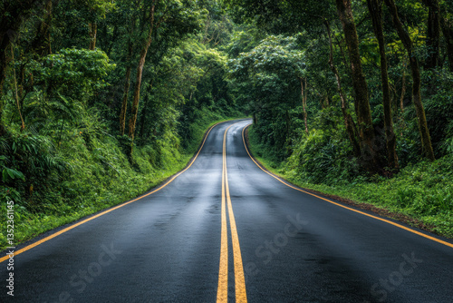 Fototapeta premium Road winding through lush jungle, sunlight filtering through dense canopy,...