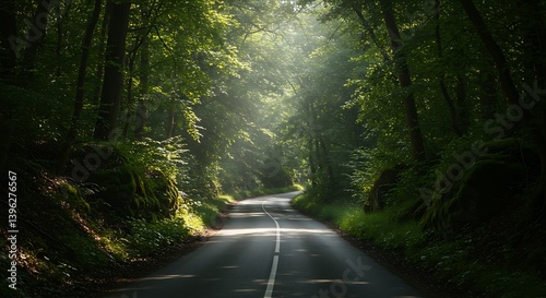 Obraz premium Road winding through verdant forest ? embracing nature's calm ? travel blog post or nature photography