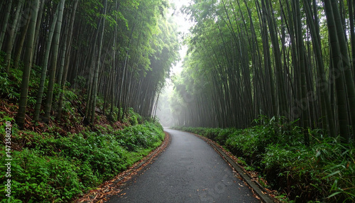 Obraz premium Road winds through lush green bamboo forest, mist hangs in the air creating a tranquil scene