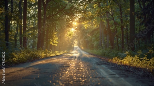 © Zilfa, Fototapeta premium Road with bold message leading into a sunlit forested landscape.