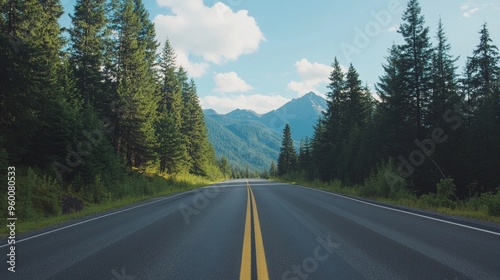 © wudu_8, Fototapeta premium Road with pine trees and mountains in the background