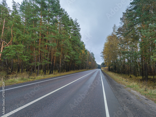 © Sergei, Fototapeta premium Road with trees on both sides and a clear sky