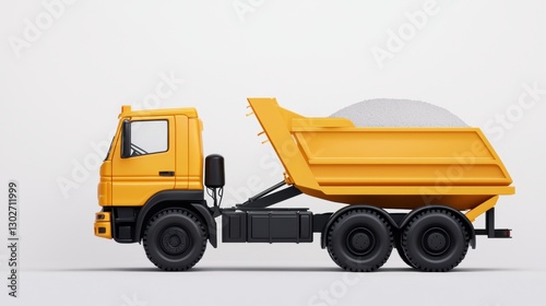 © MP-AI, Fototapeta premium Road work asphalt detours concept. A bright yellow dump truck is depicted in profile, showcasing its open bed for transporting materials on a clean, neutral background.