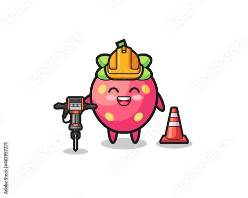 © heriyusuf, Obraz premium road worker mascot of strawberry holding drill machine