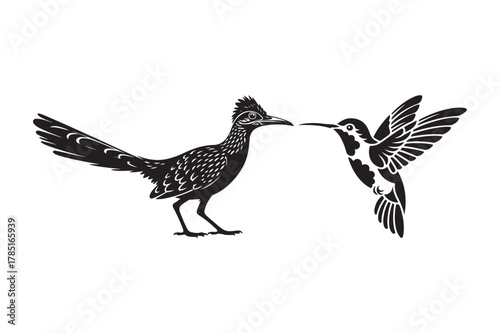 © Sadek, Obraz premium Roadrunner and hummingbird detailed black silhouette vector graphic design
