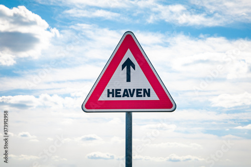 © Peter, Naklejka premium Roadsign with an arrow inside pointing to heaven
