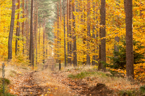© Joel, Obraz premium Roadway with golden trees autumn forest