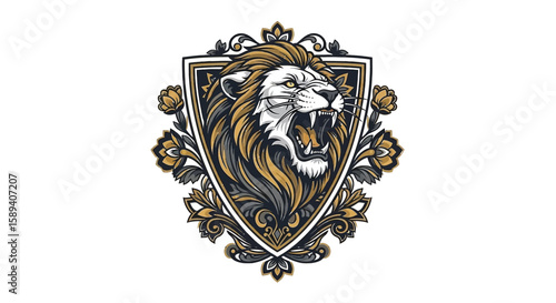 Fototapeta premium Roaring Lion Head in Ornate Shield with Floral Accents Illustration