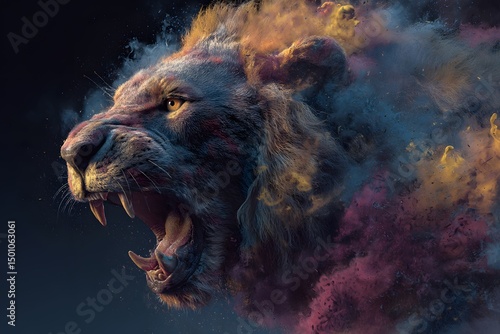 © 豆豆 胡, Naklejka premium Roaring Lion with Colorful Smoke