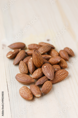 © Nikkikii, Obraz premium Roasted almonds placed on a wooden table