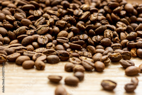 Naklejka premium Roasted arabica coffee beans scattered in a heap on the table.