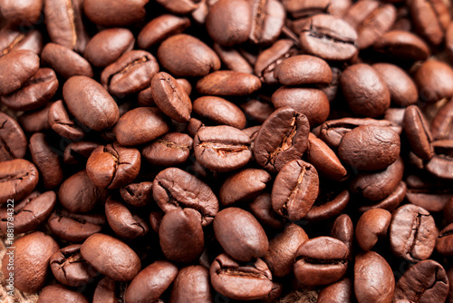 Fototapeta premium Roasted aromatic Arabica coffee beans. Close-up. An organic morning beverage ingredient.