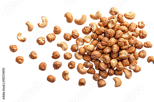© WisChi, Obraz premium Roasted cashews nuts scattered isolated transparent background