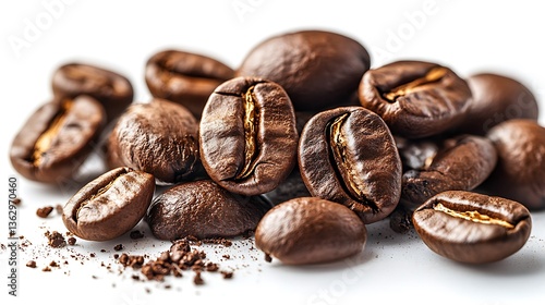 © Archibalttttt, Naklejka premium Roasted coffee beans and ground coffee resting on white background