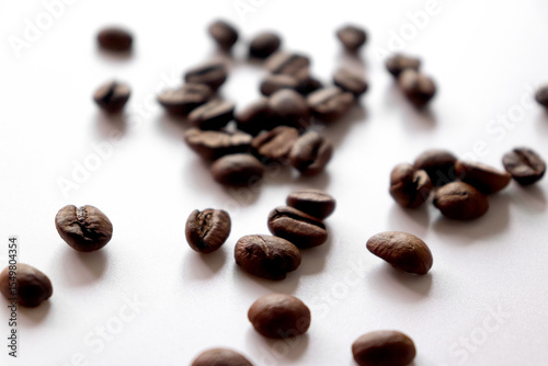 © chloe1128, Naklejka premium Roasted coffee beans are scattered on the table. White background.