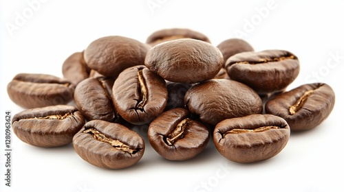 © UMI, Naklejka premium Roasted coffee beans, close-up, white background, food photography, for cafe menus