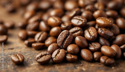© Farid Nisuki, Naklejka premium Roasted Coffee Beans Closeup on Wood Background