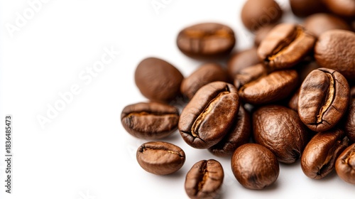 Fototapeta premium Roasted coffee beans create a rich texture on a clean white background