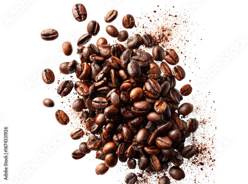 Obraz premium Roasted coffee beans exploding against black background, Isolated On Transparent Background