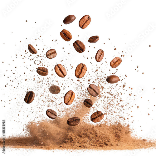 Obraz premium Roasted coffee beans exploding upwards with powdered coffee isolated on transparent background