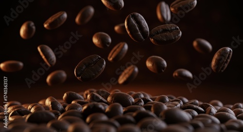 Obraz premium Roasted coffee beans fall and gather on a surface creating a dynamic...