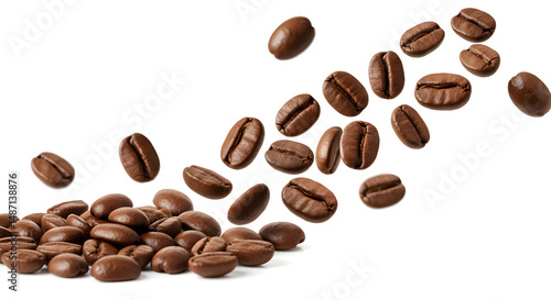 © SaifulAziz, Naklejka premium Roasted Coffee Beans Falling and Piling Up on White Background