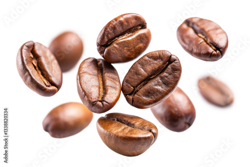 © Graphics, Fototapeta premium Roasted Coffee Beans Falling in Air Closeup View Multiple Brown Seeds