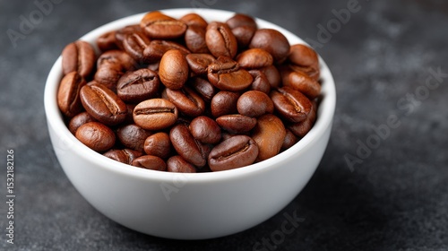 © Phanupong, Fototapeta premium Roasted coffee beans in a white bowl on dark surface Close up view of aromatic coffee beans