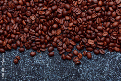 © TS-photo, Obraz premium Roasted coffee beans in bowl. Rusty background for coffee shop menu. Top view and copy space.