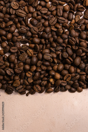 Fototapeta premium Roasted coffee beans in bulk on a light pink background. dark cofee roasted...