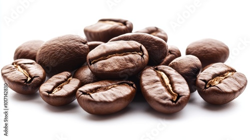 Naklejka premium Roasted coffee beans isolated on a white background, offering a delectable...